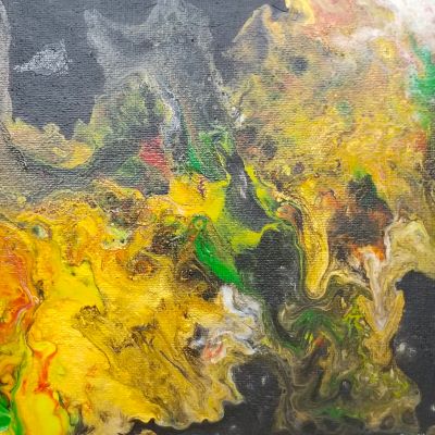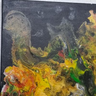 Acrylic pour on a black background with a multi coloured design including a good background of gold.  A dramatic picture.