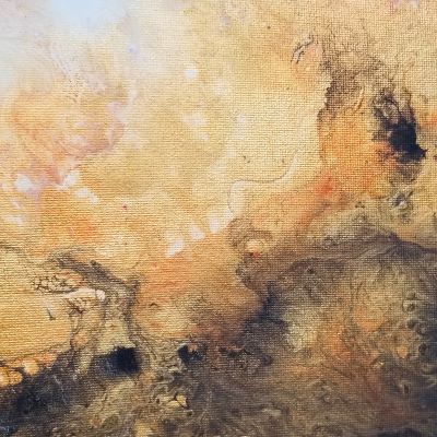 Acrylic pour on a white background and predominantly gold and black design 300 x 225 x 15 mm