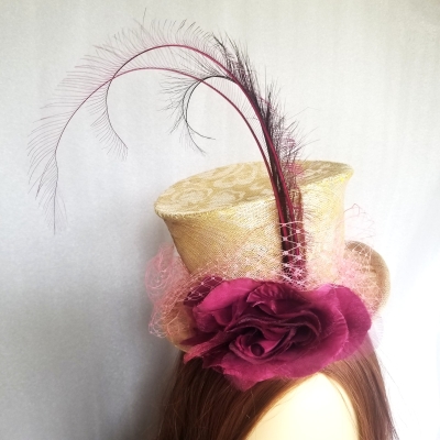 One of my group of fun top hat hatinators. These hats sit on top of the head rather than fitting over the head and are smaller than a full size top hat would be. This piece is a more asymmetric shape with yellow/ochre patterned sinamay over plain natural sinamay. It is decorated with pink veiling, an artificial maroon coloured rose and matching curled burnt feathers. The hat has elastic to secure the hat in place.