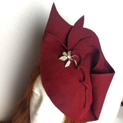Aubergine felt small sculpted hat.  An attractive hat for the cooler months of the year.  This hat has elastic to hold it in place.