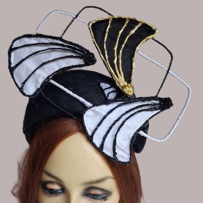 This is a black sinamay halo. There are sinamay mini fans on the base and a metal framed silk ribbon covered embellishment. The frame holds 3 silk fans one with gold ribbon edging and two with vintage black beads. The design echoes both the interior design and building shapes of the era. The headpiece is silk lined and held in place with elastic.