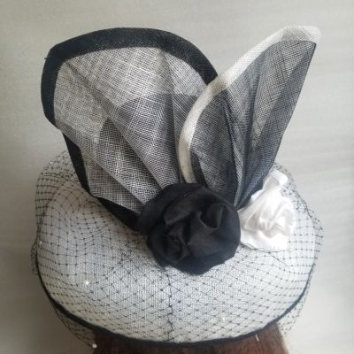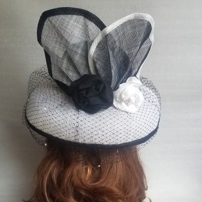 Lovely black crown and white curved brim hat with polka dot ribbon. The hat is decorated with sinamay scallops and silk roses and the brim is covered with black veiling that has tiny white pearl dots over the surface. Perfect for that special occasion.