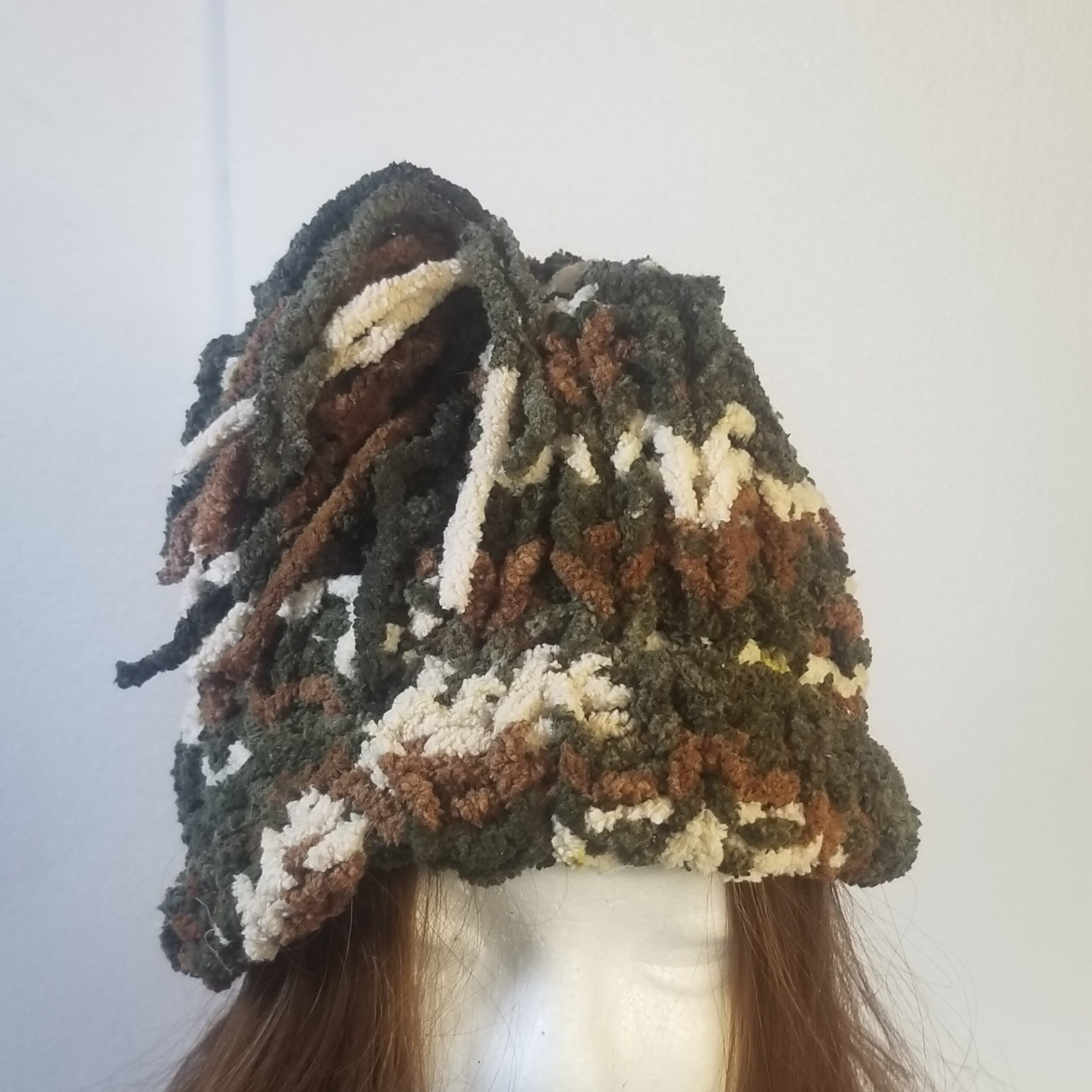 Beanie hat made from chenille yarn. Unstretched this hat is 22cm high and a circumference of 56cm