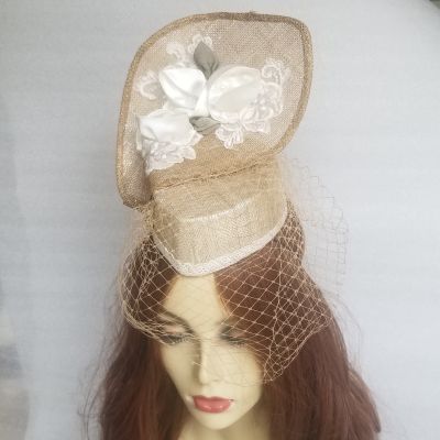Unusual shaped hatinator, a teardrop shaped pillbox. Decorated with dark gold sinamay covered with satin roses with beads. Finished with beige veiling and the base of the pillbox is edged with ribbon. The hatinator is silk lined. Elastic holds this headpiece in place.
