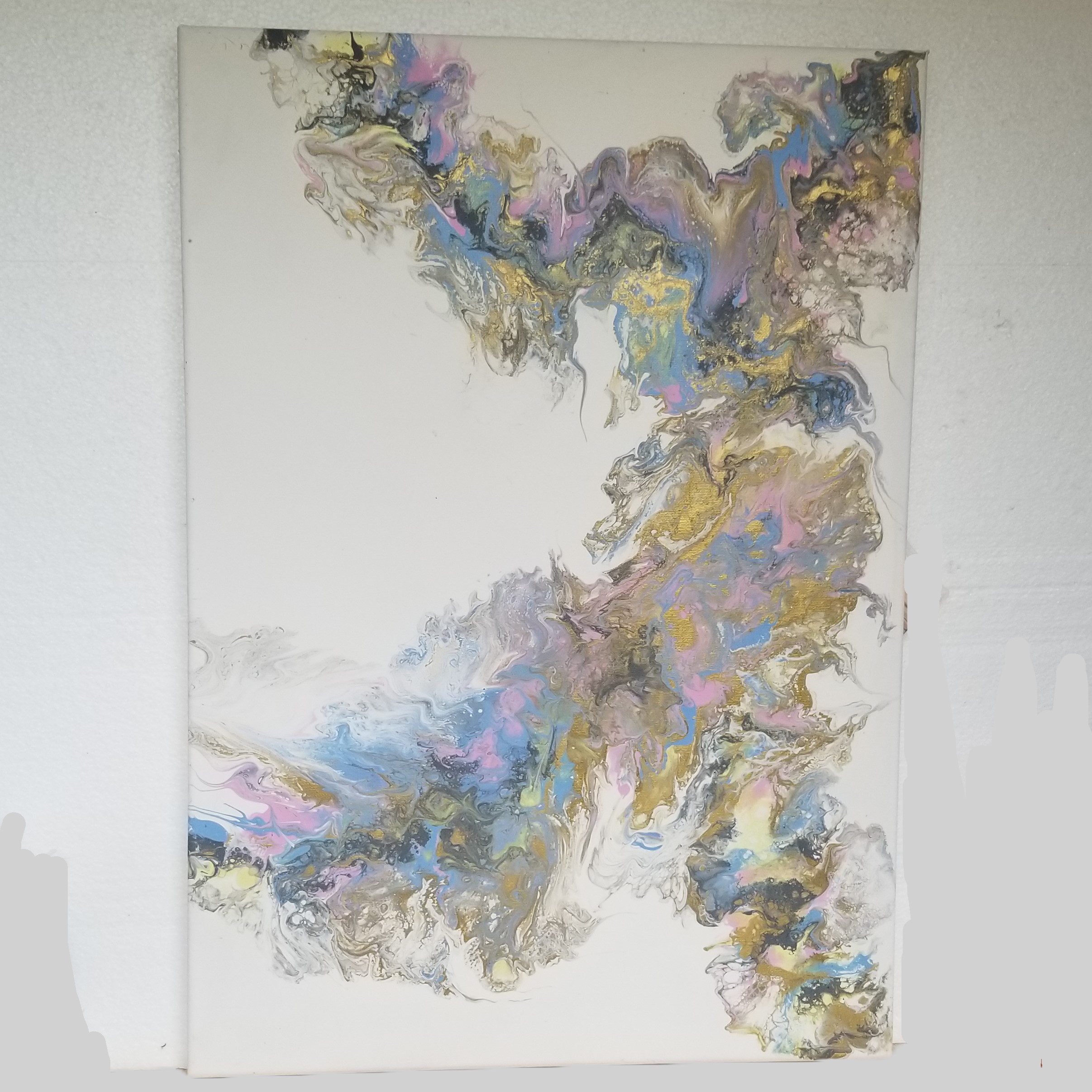 Lovely Dutch pour canvas.  White background with multicolours featuring pale blue and gold.  A great large sized picture.