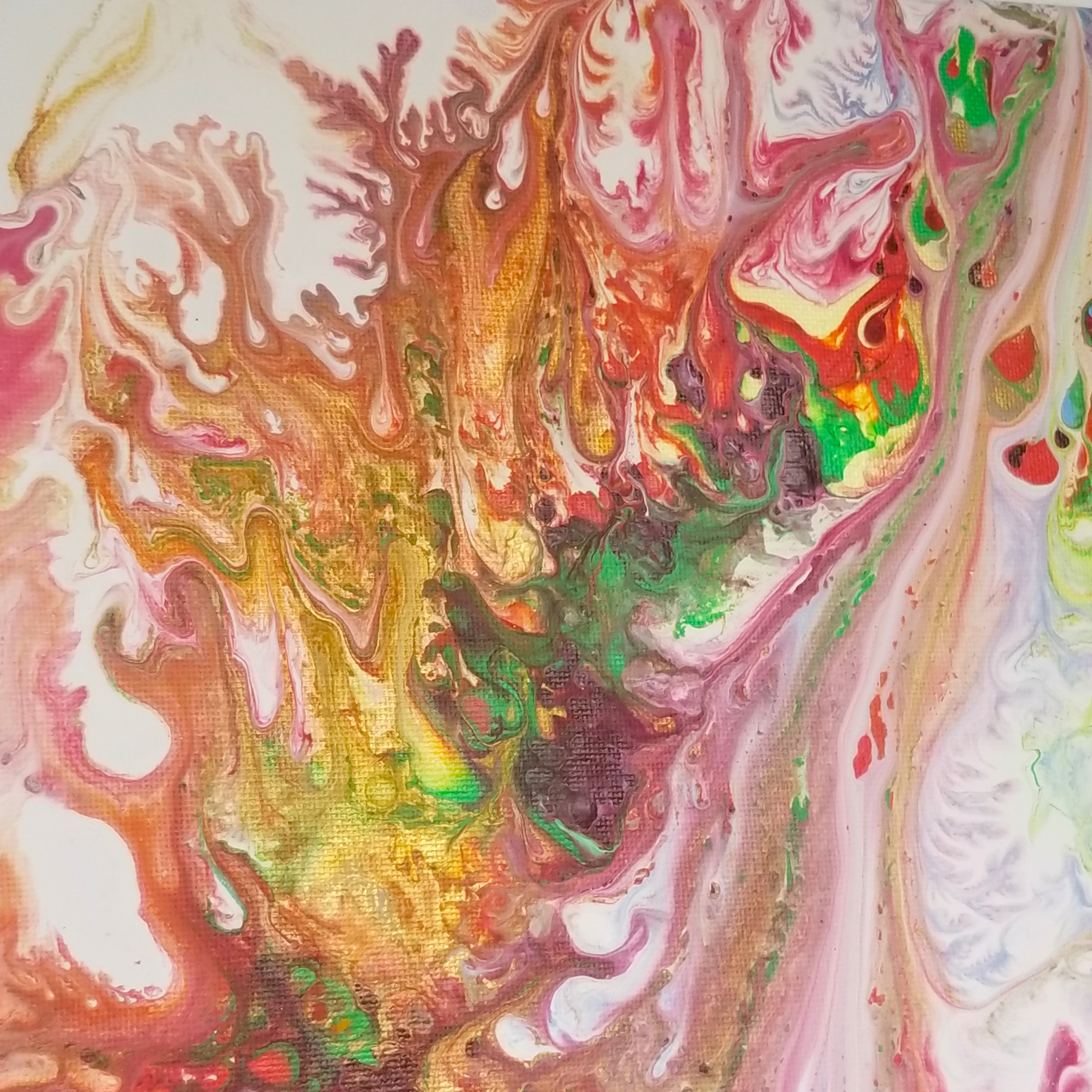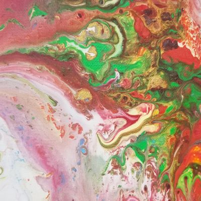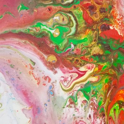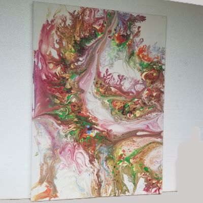 Dutch pour canvas on a white background red, green and gold 595 x 420 x 15 mm