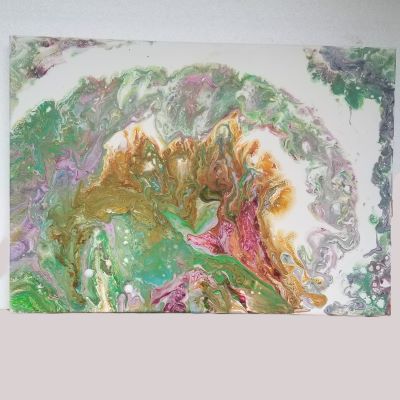 Lovely Dutch pour canvas.  White background with multi colours featuring green, red and mauve.  A great large sized picture.