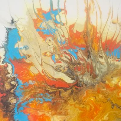 Multi coloured acrylic pour on a white background in strong colours with threads of gold throughout. 205 x 420 x 17 mm