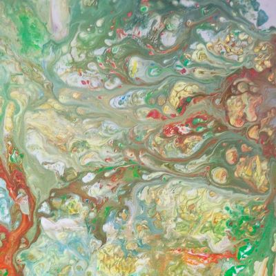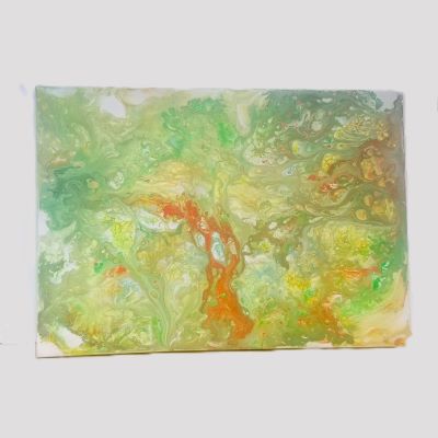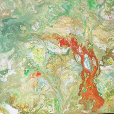 Lovely acrylic pour in shades of green with red and gold highlights.  Can be hung whichever way you prefer.