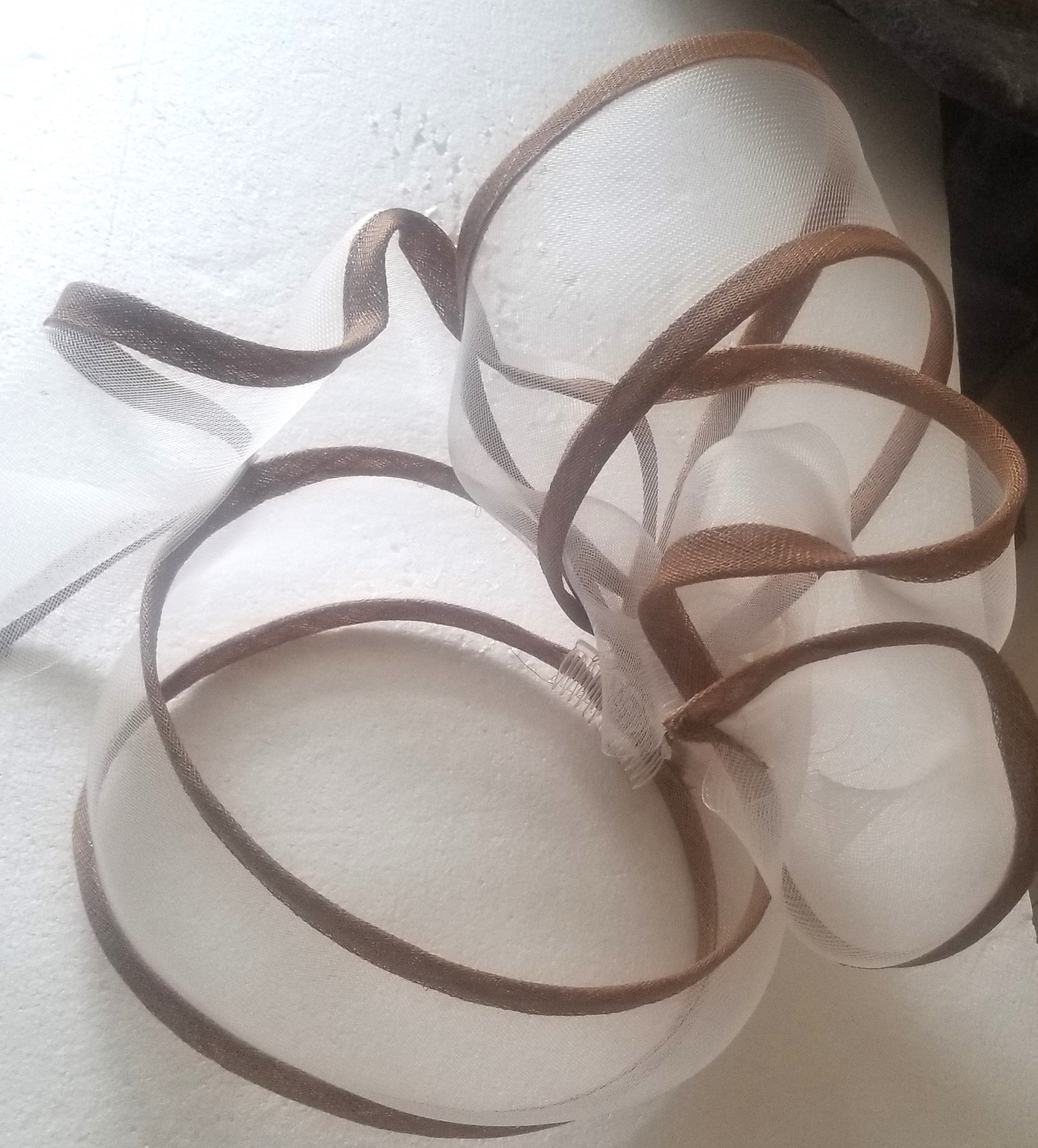 Face veil headpiece in an usual style.  This is made from crinoline and edged with sinamay with a pretty beige flower at the back.  There are combs to fix in position and loops to use hair grips.  This headpiece requires that you have a suitable hairstyle to fix and support it to prevent 'wobble' as there are no fixing points at the sides/front.