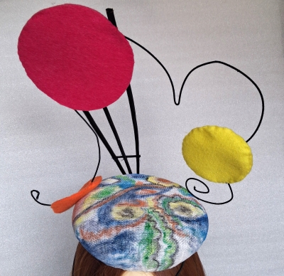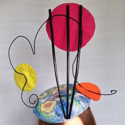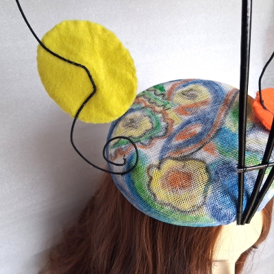 If you are looking for something a bit different this Kandinsky inspired headpiece fits the bill. It is a sinamay button hat hand painted in the style of Kandinsky and decorated with wire, ostrich quills and felt to present a 3d impression of part of one of the pieces of Kandinsky artwork. Silk lined and held in place by elastic.
