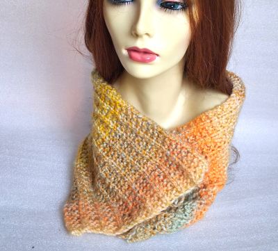 Pretty knitted collar in a rib pattern. Cosy way to keep warm without a long scarf. Shades of beige, yellow and orange. 220 x 820 mm