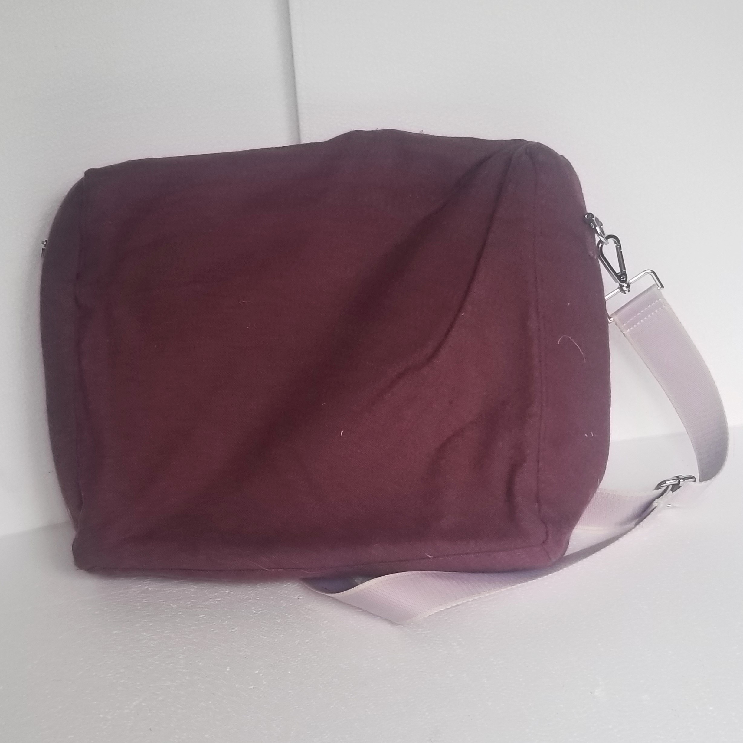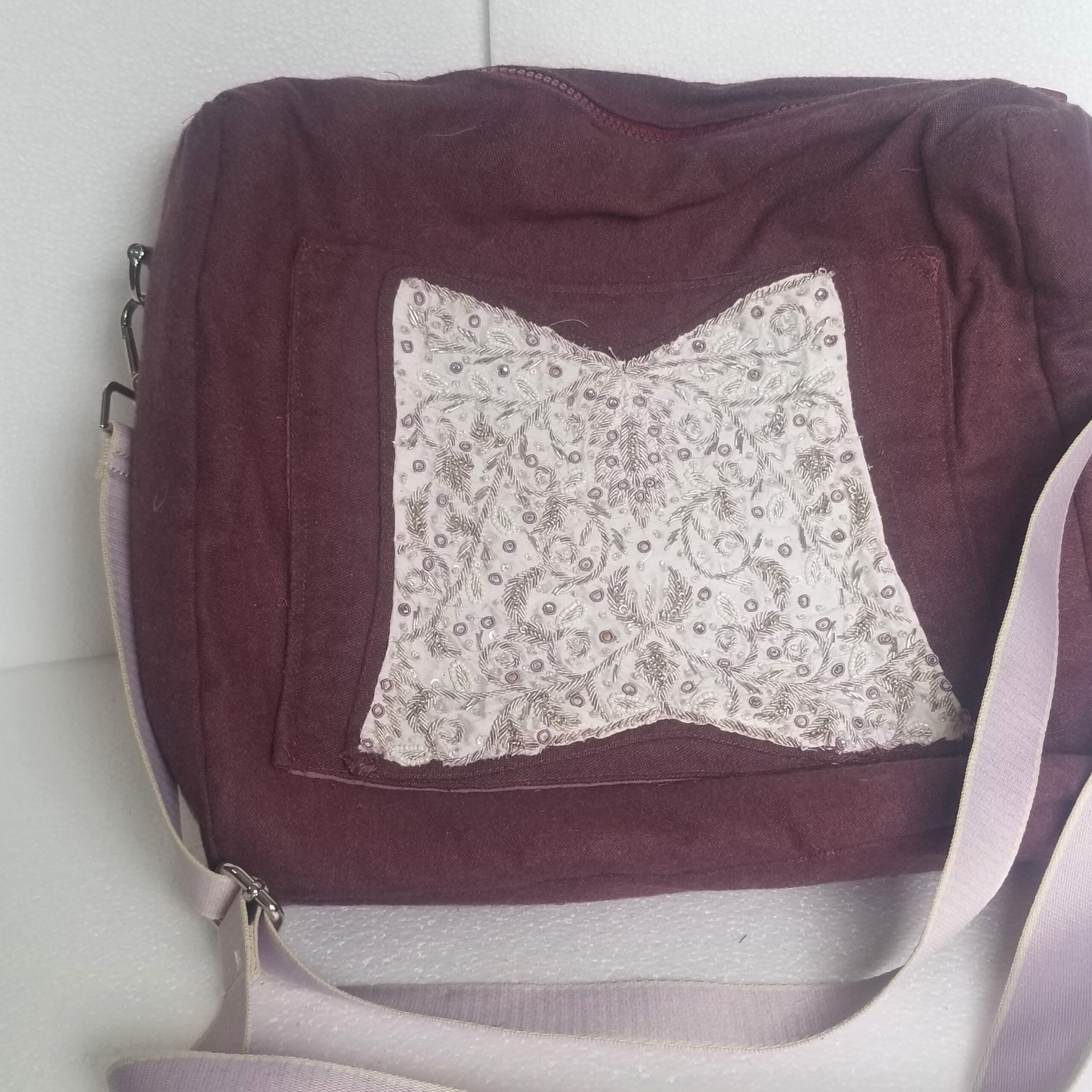 Large mauve shoulder bag.  Lined with foam for structure.  The front panel is upcycled fabric and the strap is detachable.  A good size and lightweight.