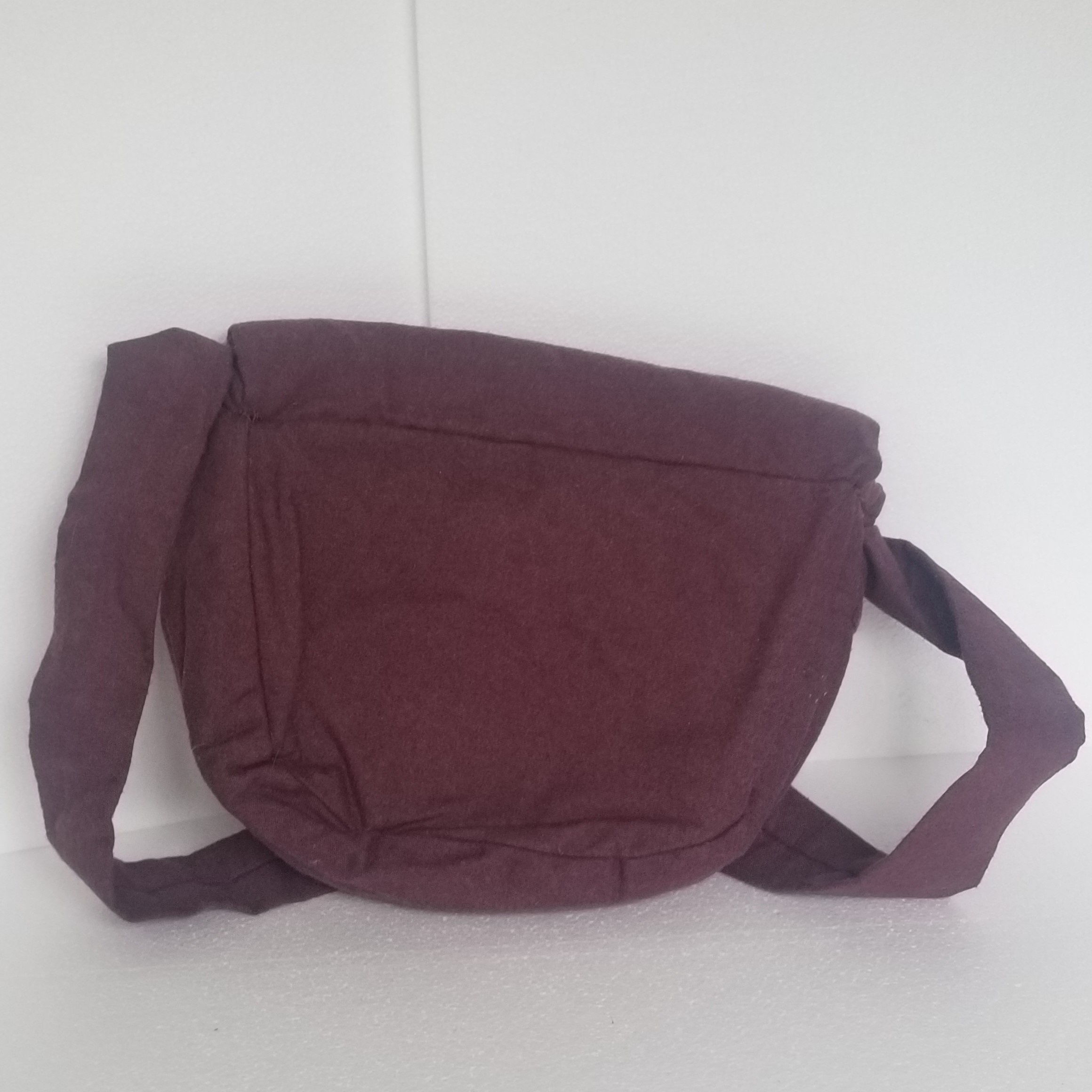 Large mauve shoulder bag.  Lined with foam for structure.  The front panel is up-cycled fabric and the strap is adjustable.  A good size and lightweight.  There is a press stud closure on the front.