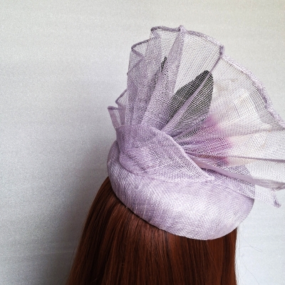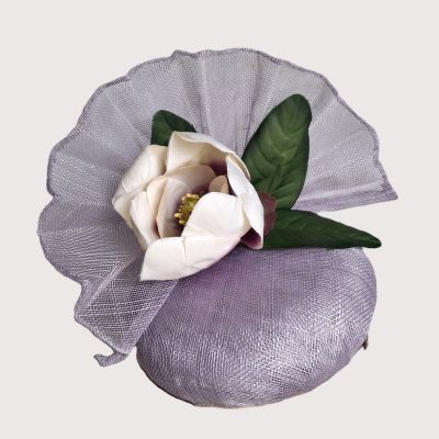 Pretty lilac button hat in sinamay with a fabric magnolia flower