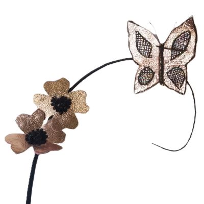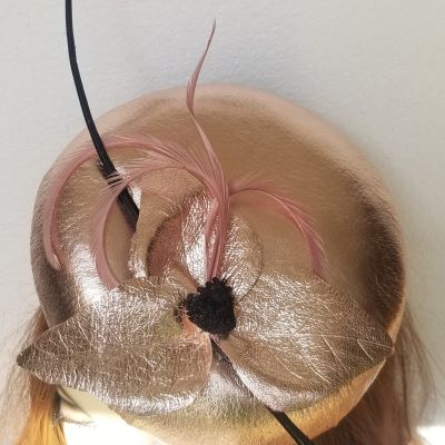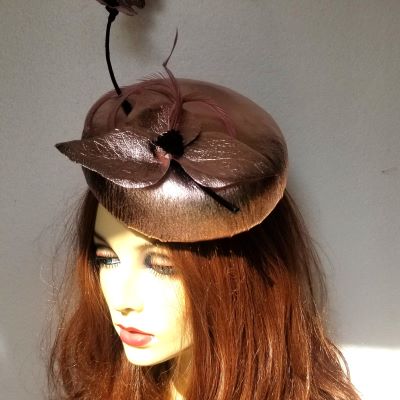 Metallic pink napa leather button hat.  Trimmed with leather flowers and butterfly on a black ostrich quill together with pink feathers.  Lined with black silk and held in place with elastic.