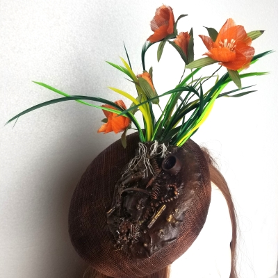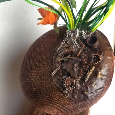 'Nature' is a design to shown how we are damaging the earth (all the rubbish in the brown powertex) and that nature still does her best to grow despite the damage we do. How much better could She grow without the rubbish we leave.  The hat has elastic to hold it in place and is fully lined.  The flowers are silk with fabric leaves and feather 'grass'.