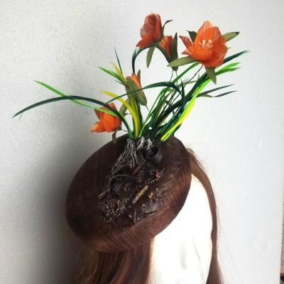 This brown sinamay button hat with powertex decoration and orange silk flowers is entitled Nature.