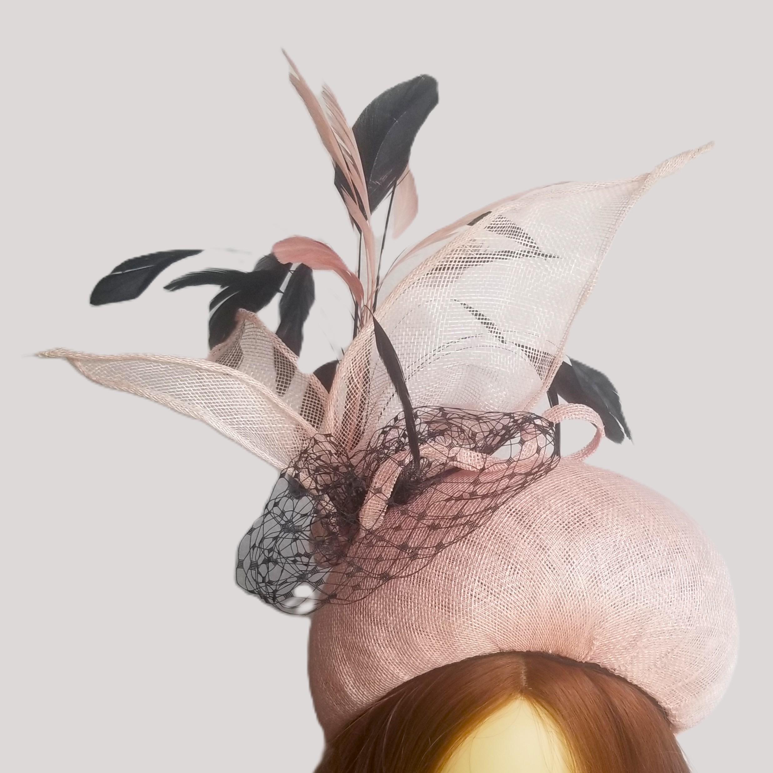 Lovely dusky pink halo trimmed with pink and black feathers and pink sinamay leaves. It is lined with black silk and fastened with elastic.