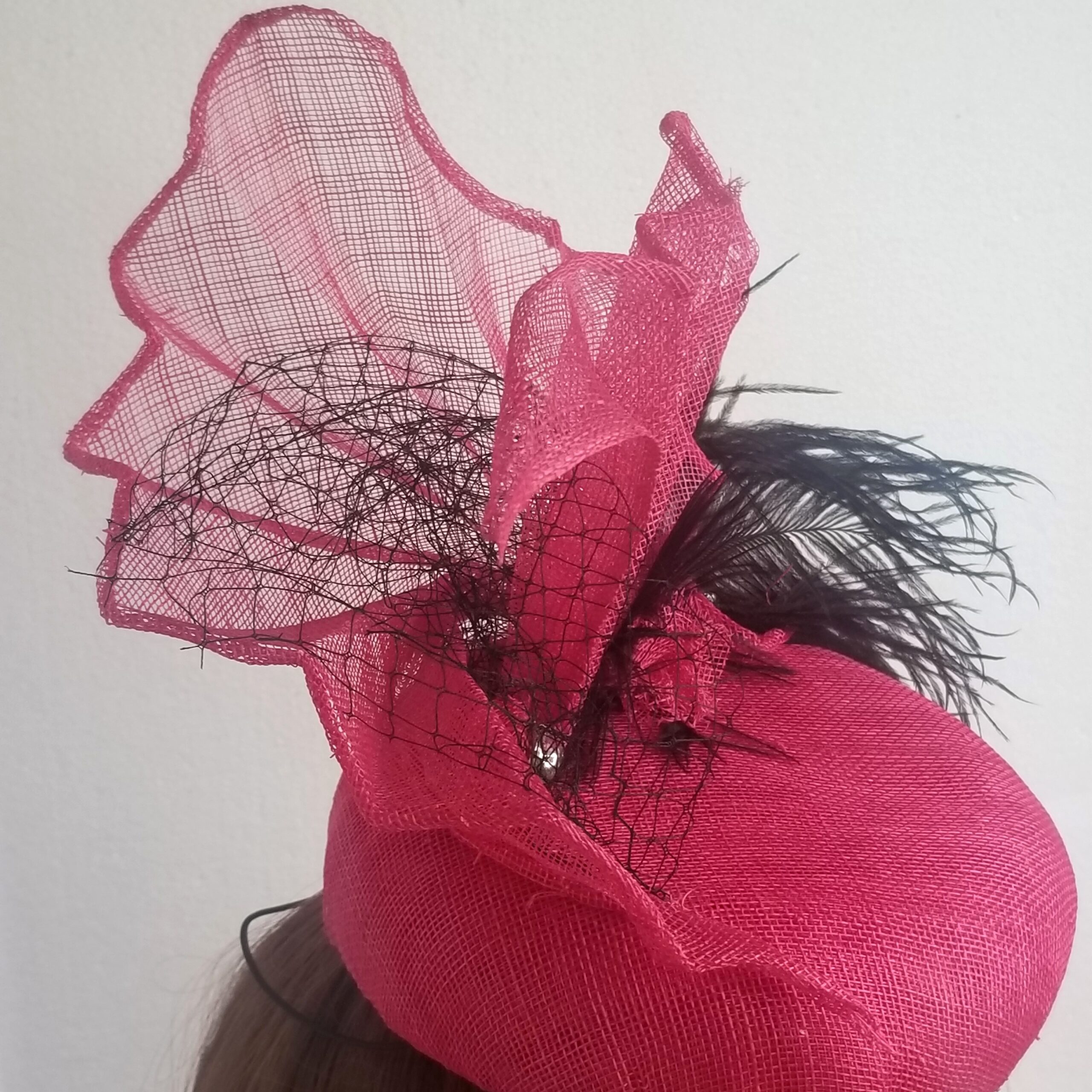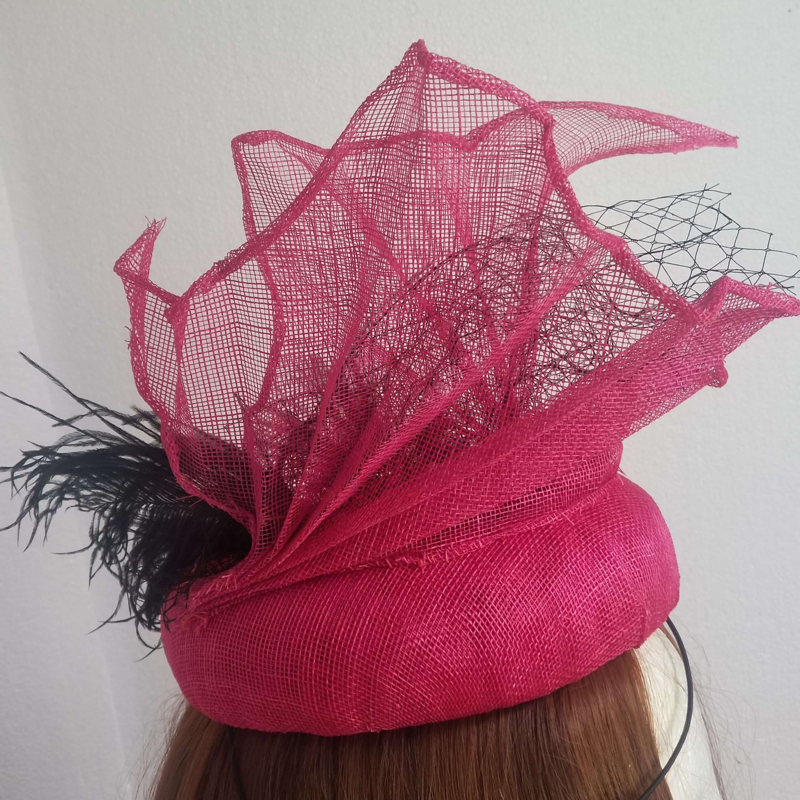 Pink sinamay button hat decorated with pleated ‘fan’ shapes and black ostrich feather and black veil netting in the fans.  A one-off design.