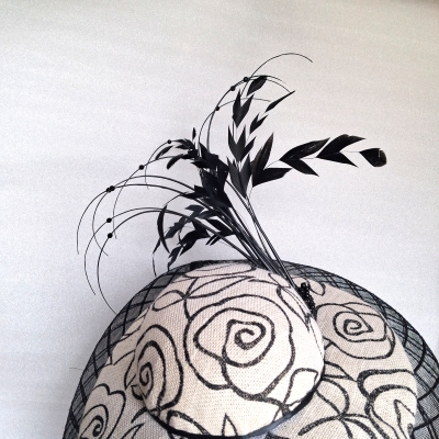 Made from a limited availability fabric with roses pattern this is a lovely unusual style brimmed hat. The brim is edge with lattice crin and the whole headpiece is set of with metallic sheen black feather, quill and bead cluster with a group of beads at the base. There is a narrow black ribbon around the base of the crown and the underside of the brim and interior of the crown is lined in black silk. The whole piece is held in place with elastic.