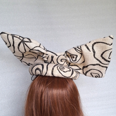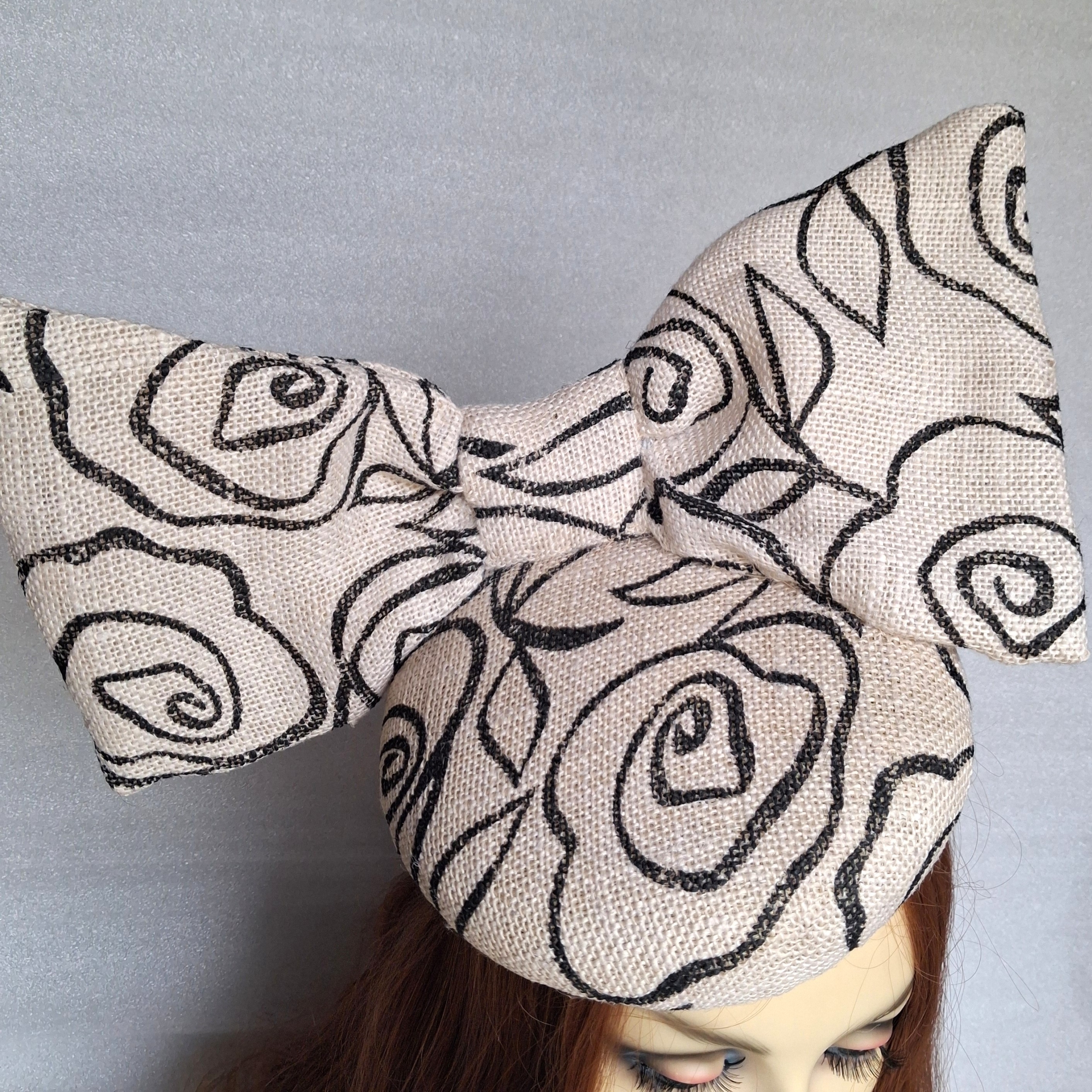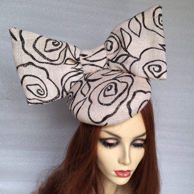 Made from a limited availability fabric with roses pattern this is an simple but stylish button hat decorated with an oversized bow. The headpiece is lined with silk and held in place with elastic.