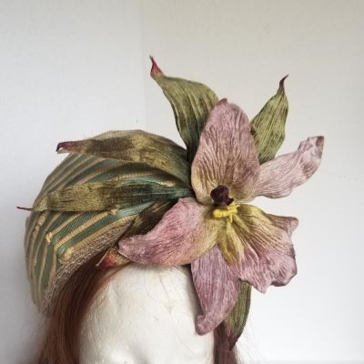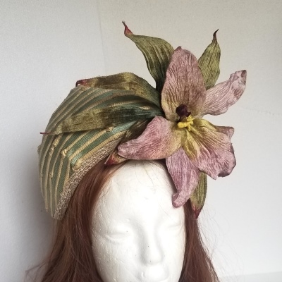 Halo in sage green buntal on a sinamay base with large velvet lily.