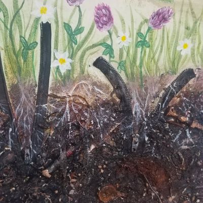 'Spring' Part of a set of 4 mixed media canvases that show how Nature has to fight back against the rubbish that we allow to pollute the land. The lower part of the image contains a selection of the types of rubbish that we leave behind us.