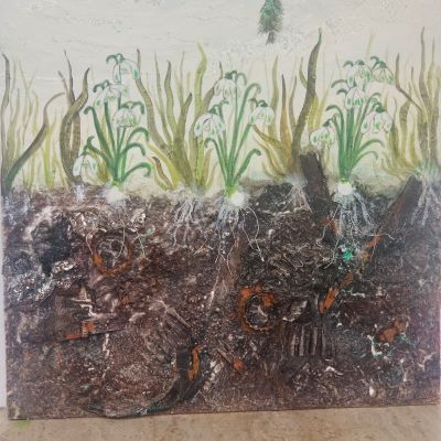 'Winter' Part of a set of 4 mixed media canvases that show how Nature has to fight back against the rubbish that we allow to pollute the land. The lower part of the image contains a selection of the types of rubbish that we leave behind us.