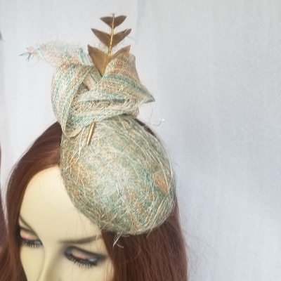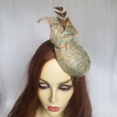 Inverted teardrop shaped fascinator in a pretty turquoise/rust/natural sinamay covered by a pale sage green coloured tangletuft sinamay. Tangletuft is a loose woven fabric that provides a lovely effect. It has a sinamay twist decoration completed with a trimmed gold feather. It is lined in silk and has elastic to secure it in place.