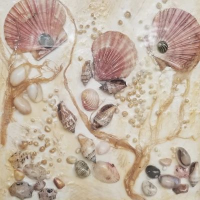 Wooden glazed box frame with mixed media image using shells.  The frame has a distressed gold finish.  Lovely piece for a seaside themed space.